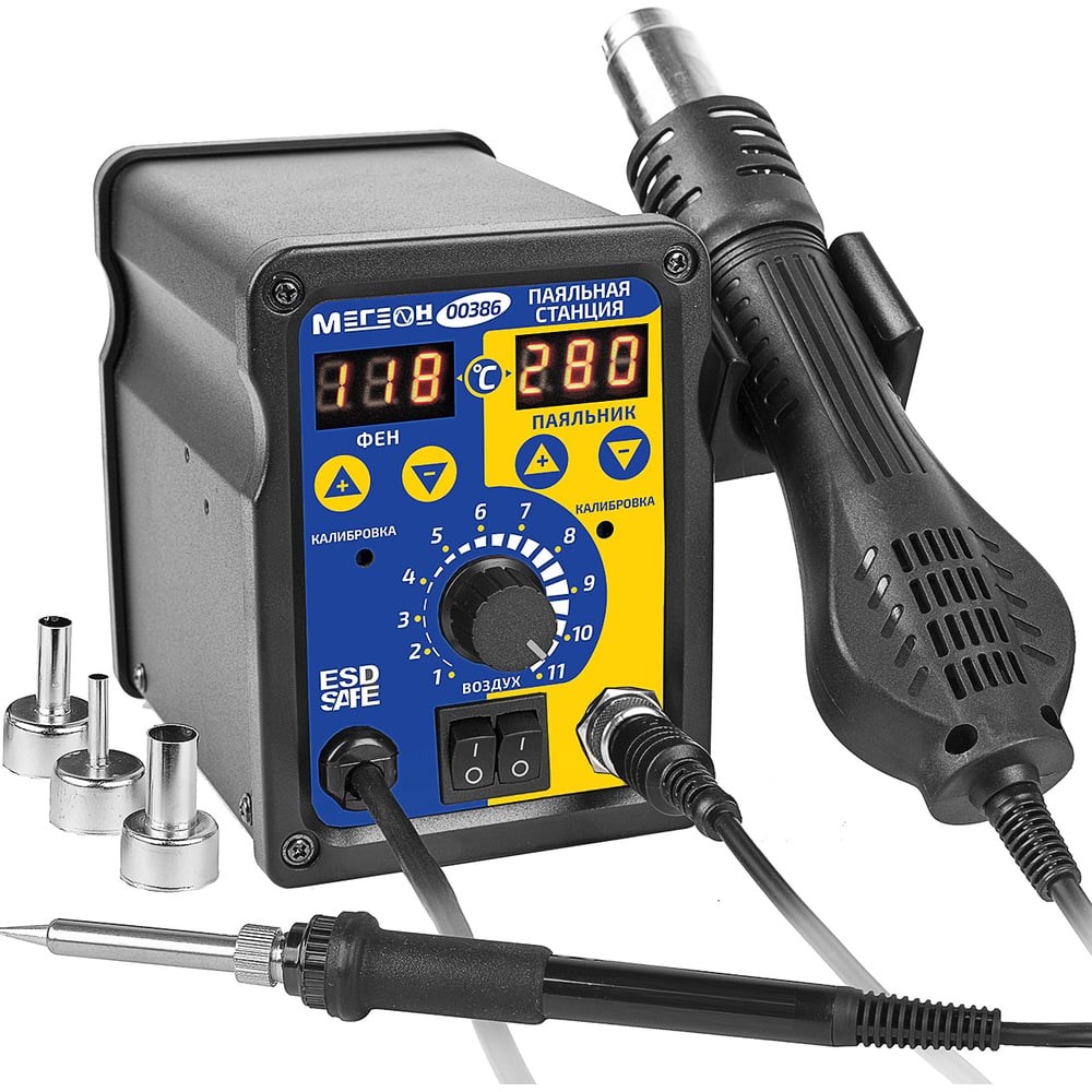 Паяльная станция МЕГЕОН 2 в 1 00386 к0000036392 - надежная и очень удобная паяльная станция 2 в 1, состоящая из термофена с центробежным нагнетателем и паяльника. Имеет компактные размеры блока управления и небольшой вес. Благодаря размещению вентилятора в рукоятке фена исключены вибрации и снижен уровень шума, возникающие при работе с подобным оборудованием, но со встроенным пневмокомпрессором. Для изготовления корпуса электрофена был применен специальный термостойкий пластик с антистатическим эффектом. Паяльник имеет конструкцию распространенного типоразмера жал, в который входит более 20-ти типов наконечников для выполнения самых разнообразных задач. Цифровые установка и контроль температуры обоих инструментов позволили достичь максимального удобства при эксплуатации, а интеллектуальное охлаждение нагревателя потока воздуха продлит его срок службы.