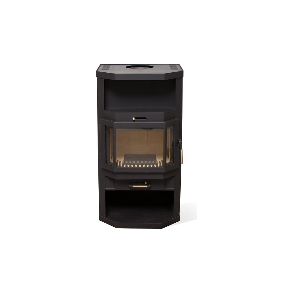 Пристенная печь с панорамным обзором оборудованная водяным теплообменником разработана как основной или вспомогательный отопительный прибор для современного дома площадью до 90 м2. Призматическая дверка из трех стекол высотой 330 мм. В отделке боковых поверхностей используется керамическая плитка. Размер поленьев 30 - 50 см. Подсоединение к дымоходу сверху или сзади.