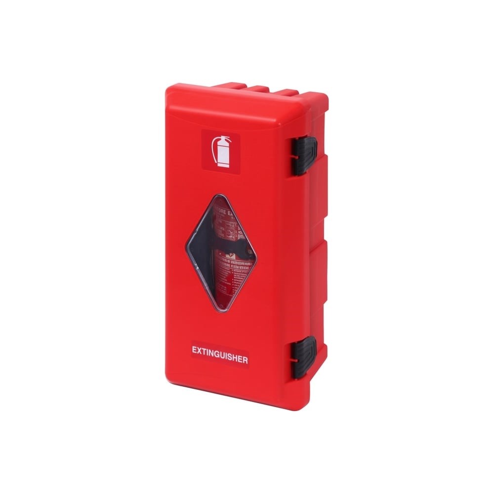 Пенал под огнетушитель DAKEN ADAMANT, пластик, 6 кг, 150-170 мм 82070 подходит для огнетушителей весом до 6 кг и диаметром до 170 мм. Пенал обладает высокой прочностью и стойкостью к износу. Дополнительные характеристики: Смотровое окно с резиновым уплотнителем Система фиксации огнетушителя, состоящая из 1-го нейлонового крепительного полукольца и ремешка ПВХ с 4-мя отверстиями 2 эргономичные ручки-защелки из нейлона Усиленные точки крепления Резиновая этикетка с пиктограммой «Огнетушитель» 8х8 см Конструкция дает возможность установить навесной замок Прочные нейлоновые стержни в шарнирных петлях, соединяющие крышку с корпусом Внутренние габариты: 522x229x150 Технология производства: литье под давлением