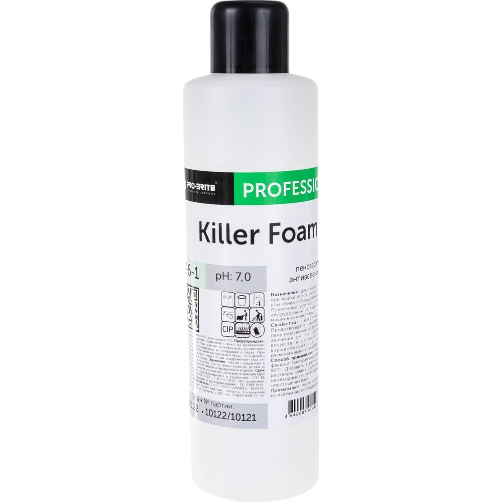 Пеногаситель Pro-Brite KILLER FOAM 1 л. 096-1 подходит для гашения пены в растворах. Применим для всех типов поломоечного оборудования, а также при CIP-мойке и машинной мойке тары. Предотвращает пенообразование независимо от температуры раствора и значения рН, что облегчает уборку. Благодаря отсутствию агрессивных веществ и растворителей не повреждает очищаемое покрытие Способ применения: энергично встряхнуть флакон! Добавить в моющий раствор. Температурный режим применения 20-85°С. Максимальное разбавление 1/350 (3мл+997мл воды=1л 0,3%-раствора). Примечание: после использования с поломоечной машиной промывать бак во избежание последующего пеногашения. Предупреждающие меры: Беречь от детей! Применять строго по назначению указанными способами. При работе использовать резиновые перчатки. Избегать проглатывания и попадания на кожу и в глаза. При попадании на кожу или волосы промыть водой, в глаза - осторожно промывать водой несколько минут. Если раздражение глаз не проходит, обратиться к врачу.