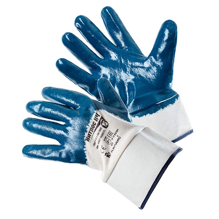 Перчатки из хлопчатобумажного трехниточного футерного трикотажного полотна, с двойным частичным покрытием из нитрильного латекса, с короткой манжетой-крагой.