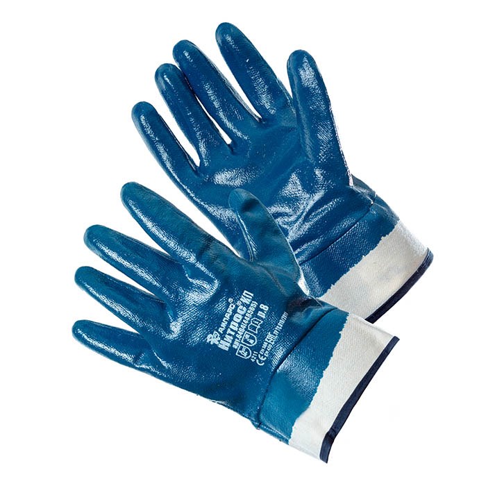 Перчатки из хлопчатобумажного трехниточного футерного трикотажного полотна, с двойным полным покрытием из нитрильного латекса, с короткой манжетой-крагой.