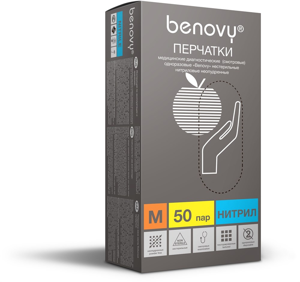 Перчатки медицинские диагностические (смотровые) одноразовые нестерильные "BENOVY" нитриловые текстурированные на пальцах голубого цвета предназначены для одноразового использования в качестве защитного барьера при ношении на руках медицинского работника во время осмотра/лечения пациента или для других санитарных целей, используются в основном как двусторонний барьер для защиты пациента и медперсонала от различных загрязнений. Перчатки текстурированы на пальцах, что обеспечивает надежный захват инструмента. Гипоаллергенные из-за отсутствия протеинов натурального латекса. Неопудренные для снижения риска контактного дерматита. Форма перчатки - плоская, без разделения на правую и левую руку. Манжета закатана в венчик. Валик скручен вовнутрь, что препятствует скатыванию перчатки. Перчатки BENOVY Nitrile Chlorinated изготовлены из синтетического материала - нитрила, что исключает появление аллергических реакций, провоцирование кожных раздражений, и предотвращает накапливание статического электричества. Перчатки обладают высокой эластичностью и растяжимостью, что обеспечивает отличное прилегание и сохранение тактильной чувствительности рук, а текстурированная поверхность – хороший захват и удержание инструмента. Перчатки полностью соответствуют действующим российским (ГОСТ) и международным стандартам в части устойчивости к растяжению и механической прочности. Внимание! Перчатки не гарантируют 100%-ой защиты от проколов и порезов. Область применения: • Медицина • HoReCa • Бьюти-индустрия • Household • Производство Условия транспортировки, хранения и утилизации: Транспортировка изделия может осуществляться всеми видами транспорта в соответствии с правилами транспортировки, действующими для данного вида транспорта. Изделия необходимо хранить в сухом месте, защищенном от воздействия прямых солнечных лучей и высокой влажности, при температуре от 10°C до 30°С. Изделие необходимо хранить вдали от источников возгорания. Сбор, временное хранение и вывоз отходов следует выполнять в соответствии со схемой обращения с медицинскими отходами, принятой в данной организации, осуществляющей медицинскую и/или фармацевтическую деятельность.