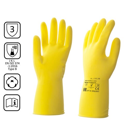 Перчатки латексные КЩС, сверхпрочные, плотные, хлопковое напыление, размер 9,5-10, XL (очень большой), желтые, HQ Profiline, 73590