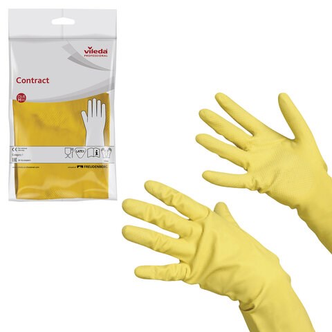 Перчатки МНОГОРАЗОВЫЕ резиновые VILEDA "Контракт", хлопчатобумажное напыление, размер 7,5-8, M (средний), желтые, вес 54 г, 174323