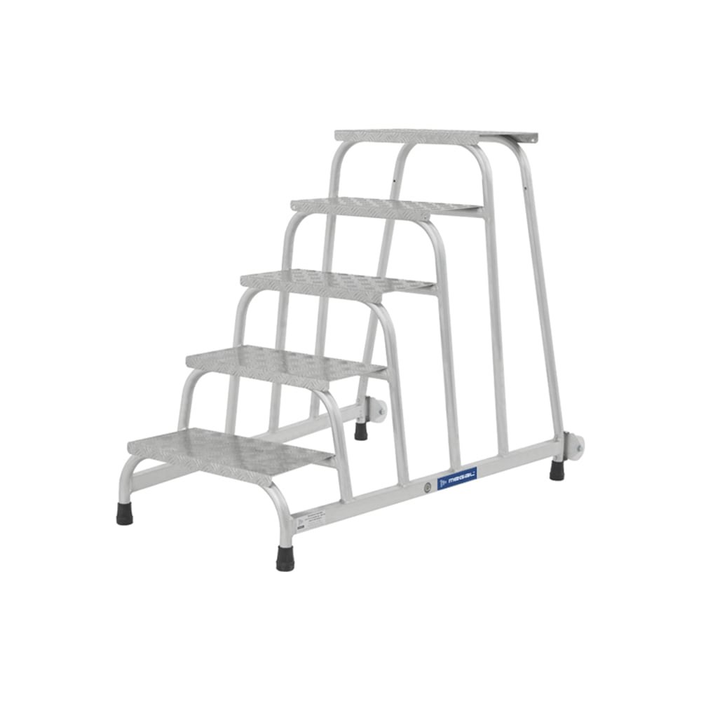 Передвижная монтажная подставка MEGAL (тип 1) 5 ступеней 050505 применяется при проведении строительных и монтажных работ на небольшой высоте. Верхняя площадка размером 31х51 см позволяет комфортно разместиться. Ступени глубиной 25 см, выполненные из рифленого листового алюминия, обеспечивают безопасный и удобный подъем/спуск. Ножки подставки укомплектованы резиновыми противоскользящими башмаками, что гарантирует устойчивость на поверхности. Для удобства перемещения по рабочей территории модель оснащена комплектом колес.