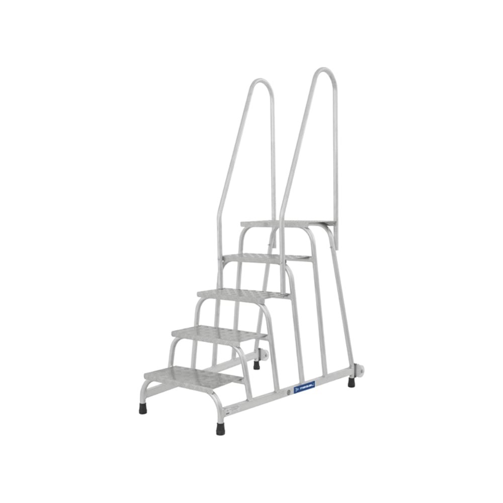 Передвижная монтажная подставка с двумя поручнями MEGAL (тип 1) 5 ступеней 050705 применяется при проведении строительных и монтажных работ на небольшой высоте. Верхняя площадка размером 31х51 см позволяет комфортно разместиться. Ступени глубиной 25 см, выполненные из рифленого листового алюминия, обеспечивают безопасный и удобный подъем/спуск. Ножки подставки укомплектованы резиновыми противоскользящими башмаками, что гарантирует устойчивость на поверхности. Для удобства перемещения по рабочей территории модель оснащена комплектом колес.