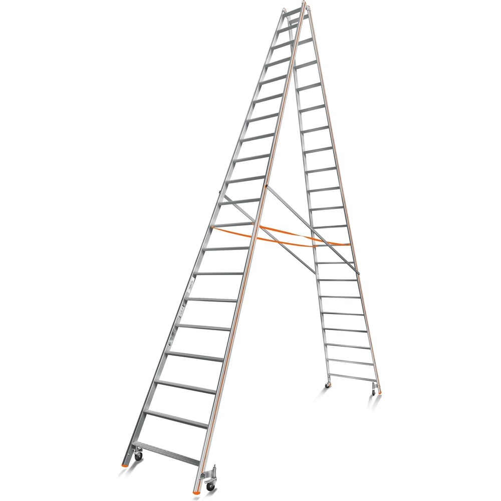Передвижная двусторонняя стремянка Эйфель Комфорт Профи 220 Роллер используется в различных сферах деятельности человека. Отличается небольшим весом и прочностью. Не подвержена коррозии, так как изготовлена из алюминия. В сложенном состоянии имеет компактные размеры. Колеса обеспечивают легкое перемещение лестницы во время эксплуатации. Нагрузка, на которую рассчитана данная модель, составляет 150 кг.Стремянка имеет 4 точки опоры и устойчива даже на скользкой поверхности. Оснащена ступенями с рифленой поверхностью - для безопасного спуска/подъема.Подходит как для профессиональных работ, так и для работ в быту.Корпус выполнен из алюминиевого профиля овального сечения. Такой профиль выдерживает большие нагрузки, чем прямоугольный, за него комфортно держаться при подъеме-спуске, удобен при перемещении или переносе лестницы.Ступени выполнены из профиля шириной 63 мм с глубокой насечкой. Они располагаются строго горизонтально при приведении лестницы в рабочее положение. Комфортная работа на стремянке с широкими ступенями особенно ощущается при длительном нахождении на высоте.Опоры выполнены из полимера, устойчивого к истиранию и температурам в диапазоне от -40 до +50 градусов С.Модель имеет двойные фиксаторы-ловушки, скрепляющие секции при хранении или транспортировке.