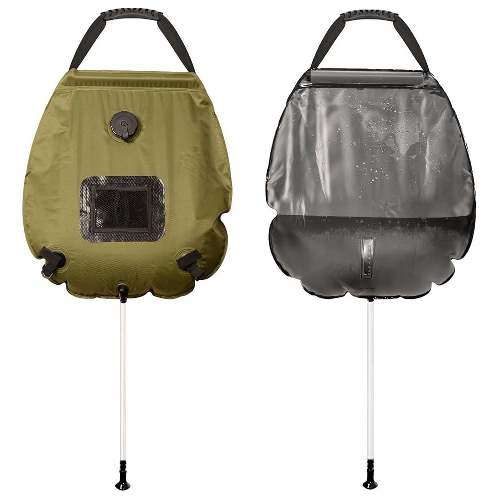 Переносной душ пригодится если вы собираетесь в поход, на рыбалку, охоту, кемпинг. Необходим для туристов и путешественников в летнюю жару. Подойдет для дачи, как временный летний вариант освежиться после трудового дня. Емкость выполнена из материала, который способствует нагреву воды на солнце. Также можно налить заранее подготовленную теплую воду. Душ подвешивают выше уровня головы человека, вода будет течь самотеком через шланг с душевой лейкой, расположенный в нижней части душа. Чтобы открыть подачу воды из душа, потяните насадку душевой лейки на себя. Для остановки потока воды нажмите на насадку до упора и зафиксируйте шланг с лейкой на мешке в поднятом состоянии с помощью петли на липучке «велькро». Туристический душ оборудован термометром для определения температуры воды. При нагреве мешка под воздействием солнечных лучей на шкале термометра проявляются цифры, соответствующие температуре содержащейся в емкости воды. Солнце может нагревать воду до 53°C. В комплекте имеется удобный сетчатый мешок для хранения и переноса душа.