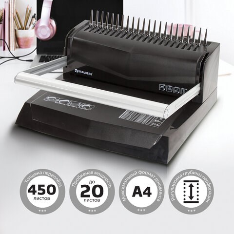 Переплетная машина для пластиковой пружины BRAUBERG B20, пробивает до 20 листов, сшивает до 450 листов, 530960