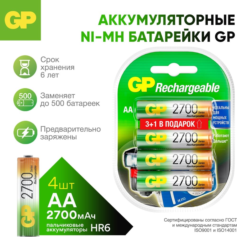 Основные преимуществаНикель-металлогидридные аккумуляторы GP отличаются долгим сроком службы, стабильной работой в широком температурном диапазоне и способны выдерживать до 300 циклов зарядки. Они подходят для различных энергоемких портативных устройств, таких как игровые консоли, фонарики, MP3-плееры, пульты дистанционного управления, часы, компьютерные мыши и клавиатуры, фотоаппараты и другие гаджеты.Емкость 2600 мАч обеспечивает долгую и стабильную работу устройств, поддерживая рабочее напряжение до полной разрядки.Отсутствие эффекта памяти позволяет заряжать аккумуляторы в любое время без необходимости полной разрядки, сохраняя их номинальную емкость.Комплект GP 270AAHC31RGY-2CRCB4в блистерной упаковке – это выгодное предложение: четыре аккумулятора по цене трех, что позволяет дополнительно сэкономить.ХарактеристикиТипоразмер: ААТип аккумулятора: NiMHРазмеры: 50,5 x14,5ммТемпературный диапазон: от -20 до +50°CЕмкость: 2600 мAчНоминальное напряжение: 1.2 ВКоличество в комплекте: 4 шт.