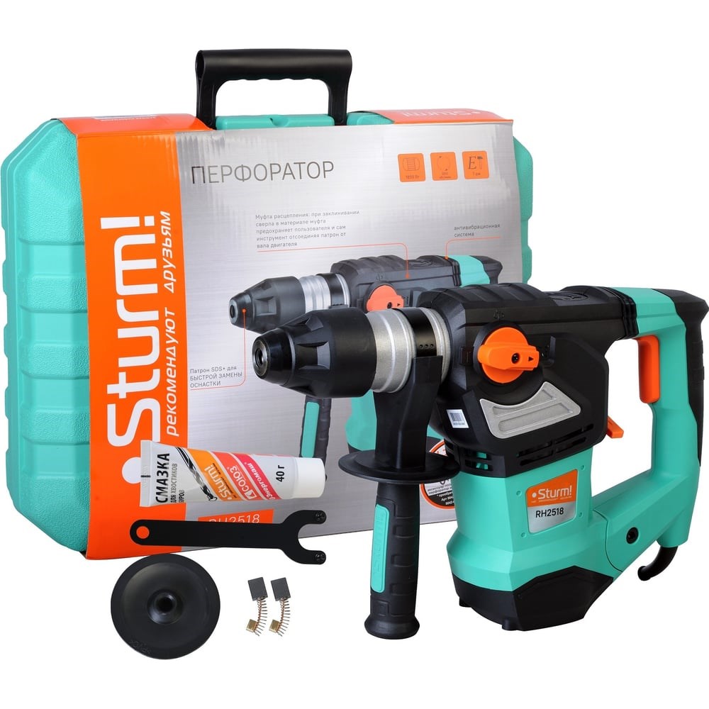 Sturm RH2518 –имеет вертикальную компоновку, которая предполагает установку мощных двигателя и механической части при сохранении умеренных габаритных размеров корпуса. Инструмент обладает отличной развесовкой, за счет чего достигается его уверенный контроль, а также тщательно проработанной эргономикой. Дополнительный комфорт обеспечивает специальный антивибрационный демпфер, значительно снижающий уровень вибрации при работе. Модель оснащена мощным 1850 Вт электромотором и ударным механизмом, развивающим высокую энергию удара в 7 Дж – это позволяет быстро и эффективно бурить сквозные отверстия диаметром до 36 мм в материалах различной твердости, включая камень и различные марки бетона. При необходимости, возможно использование полых коронок больших диаметров (бетон – 68 мм / кирпич – 90 мм). Для обеспечения высокого ресурса инструмента особое внимание уделено наиболее нагруженным элементам конструкции: электромотор покрыт несколькими изоляционными слоями термостойкого лака с дополнительным бронированием армирующей нитью, защищающей от воздействия абразивных частиц, шестерни редуктора изготовлены из высококачественной стали и подвержены закалке, усилен ударный механизм, подшипники и пусковая кнопка имеют пылезащиту. Корпус редуктора и ствол ударной части выполнены из литого алюминия, за счет чего обеспечивается лучший теплоотвод от элементов ударного механизма, во избежание перегрева при непрерывной эксплуатации.