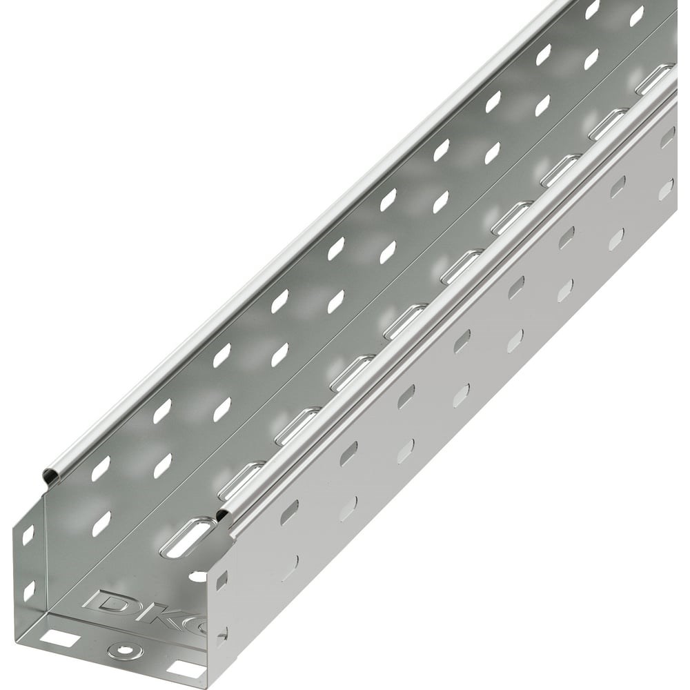 Перфорированные листовые лотки ДКС применяются для прокладки кабеля как в помещении, так и на открытом воздухе. Лотки отличаются высокой несущей способностью – подформовка, производимая при производстве этой продукции, создает дополнительное ребро жесткости, что увеличивает несущую способность системы до 54%. Перфорация сокращает вес конструкции. В лотках имеются отверстия для отвода кабеля. Степень пыле- и влагозащиты перфорированных лотков – IP 10 при использовании крышек, входящих в состав системы. Метод соединения "мама-папа" применяемый для системы, существенно сокращает время монтажа и создает непрерывный контур. Конструктив листовых лотков ДКС предупреждает повреждение кабеля при прокладке. Высота лотка – 100 мм, ширина – 100 мм, длина – 3000 мм, толщина - 0,7 мм. Перфорированные лотки в исполнении "Цинк-ламель" имеют специальное покрытие, устойчивое к коррозии из химически активной магниевой смолы с добавлением хлопьев цинка и алюминия. Цинк-ламельное покрытие изделий ДКС по коррозионной устойчивости аналогично покрытию "Горячий цинк". Оно обеспечивает электрохимическую и барьерную защиту от коррозии.