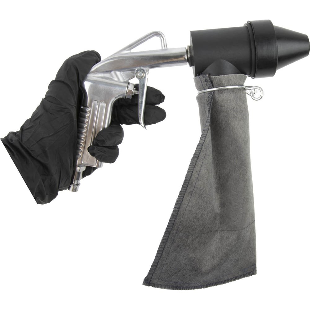 Пескоструйный пистолет OPTIMUS OPT-PS10 предназначен для локальной обработки металлических поверхностей с помощью абразивных материалов. Устройство оснащено системой рециркуляции, благодаря которой расход абразива значительно снижается, а рабочее пространство остается чистым. Взятый из мешка и выходящий с большой скоростью абразив после соударения с обрабатываемой поверхностью не разлетается в разные стороны, а блокируется в резиновом колпачке и вместе с выходящим воздухом переносится обратно в мешок с абразивным порошком.Пистолет эффективно удаляет ржавчину, старую краску и другие загрязнения, особенно в труднодоступных местах. Подходит для обработки литых и штампованных дисков, отбортовок крыльев, порогов и мелких очагов коррозии.