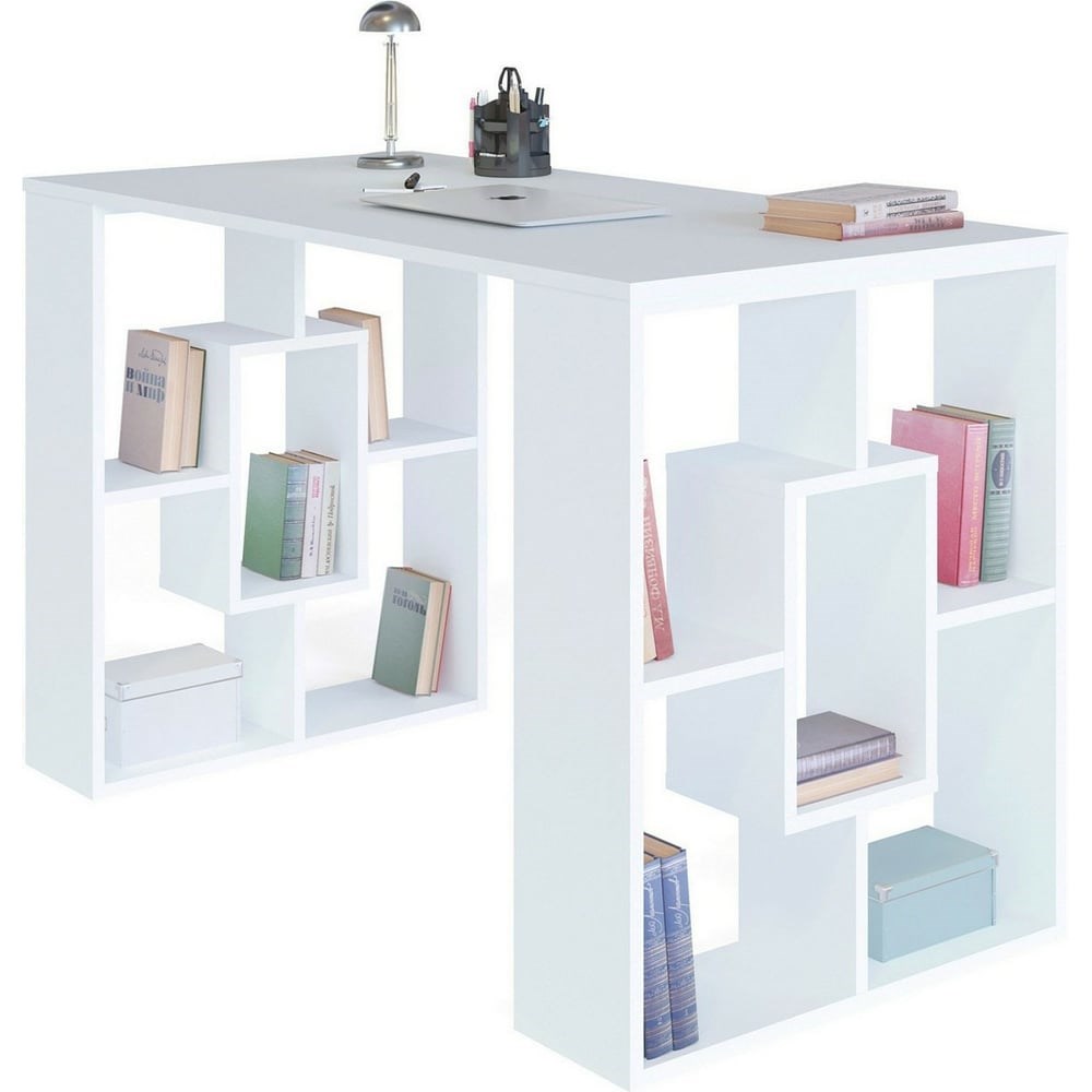 Письменный стол СОКОЛ белый СПм-15 СПм15Б6 понравится всем любителям минималистичных светлых деталей в интерьере. Создавая эту модель, дизайнеры отошли от привычного оформления письменно стола и сделали его ножки функциональными — в виде стеллажей. Больше не нужно подбирать громоздкие тумбы, на столе достаточно места для ноутбука и нужных в работе материалов, а на его опорах — для книг, канцелярии и любимых предметов для настроения. Вы можете поставить стол вдоль стены, перпендикулярно к ней, по центру комнаты или использовать его для зонирования пространства. Стол будет выглядеть как свежий глоток воздуха в комнате благодаря окошкам в ножках-стеллажах. Изделие выполнено из ЛДСП толщиной 16 мм, края обработаны кромкой ПВХ 2 и 0,4 мм.