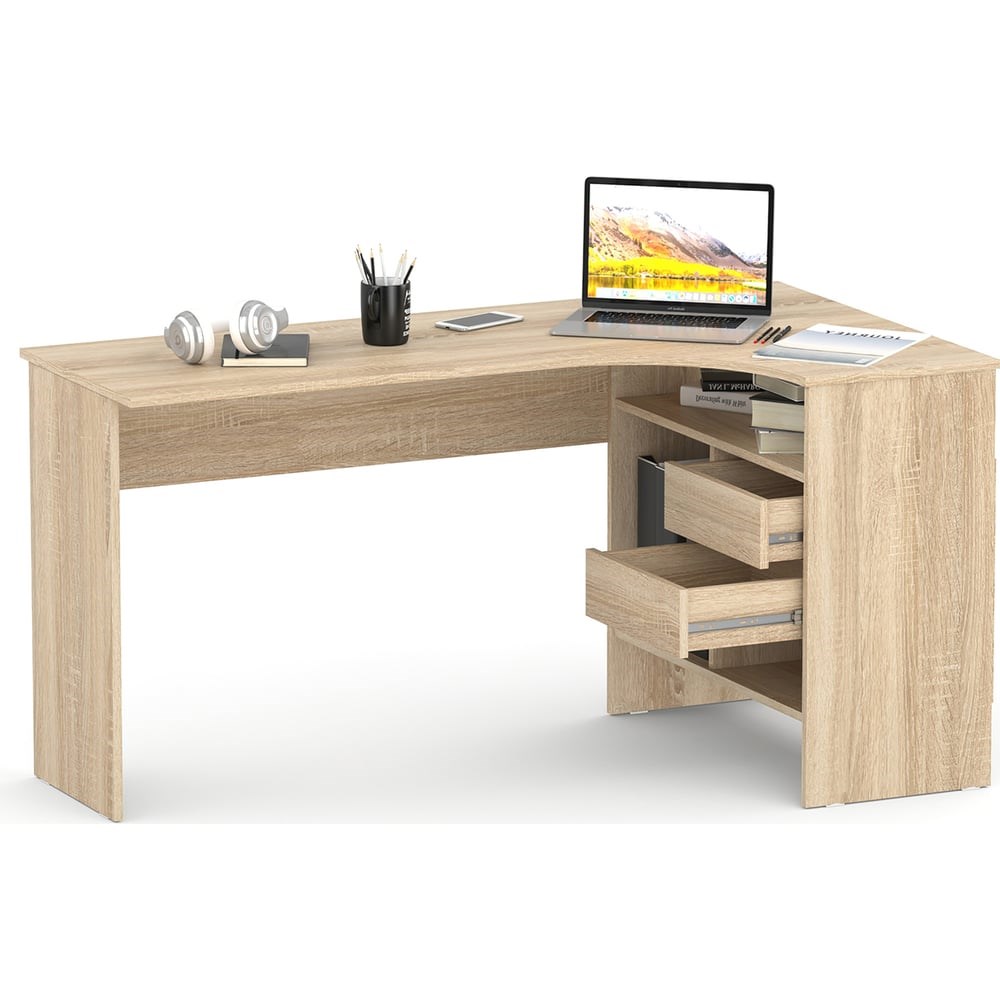 Угловой письменный стол СПм-25 — идеально решение для обустройства полноценного рабочего места в домашнем кабинете или офисе. На широкой столешнице найдется место для большого монитора, клавиатуры или ноутбука, а также сопутствующей техники. В выдвижных ящиках и открытых отделениях удобно хранить книги и канцелярию. Кроме того, конструкцией предусмотрена ниша под системный блок.Характеристики:Материал: ЛДСП.Тип направляющих: шариковые полного выдвижения.Ориентация сборки: правосторонняя (определяется по расположению тумбы).Задняя стенка сделана из ДВП белого цвета.