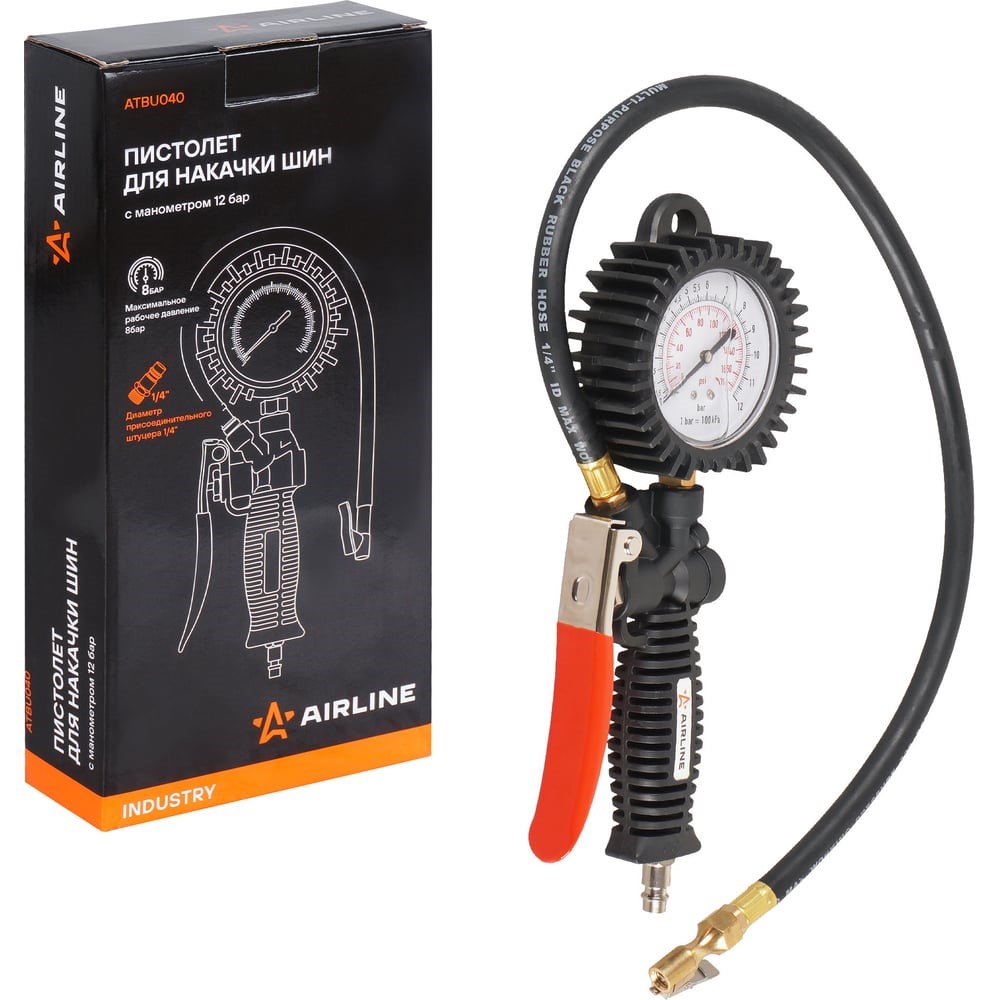 Пистолет для накачки шин с манометром 12 АТМ INDUSTRY AIRLINE ATBU040, корпус которого изготовлен из нейлона. Манометр защищён резиновым чехлом. Гибкий шланг имеет быстросъёмный наконечник. Конструкцией предусмотрена функция для сброса лишнего давления. В комплект входит присоединительный фитинг 1/4". Состав: металл/пластик Максимальное рабочее давление: 8 ATM Диаметр присоединительного штуцера: 1/4" Длина шланга, мм: 440