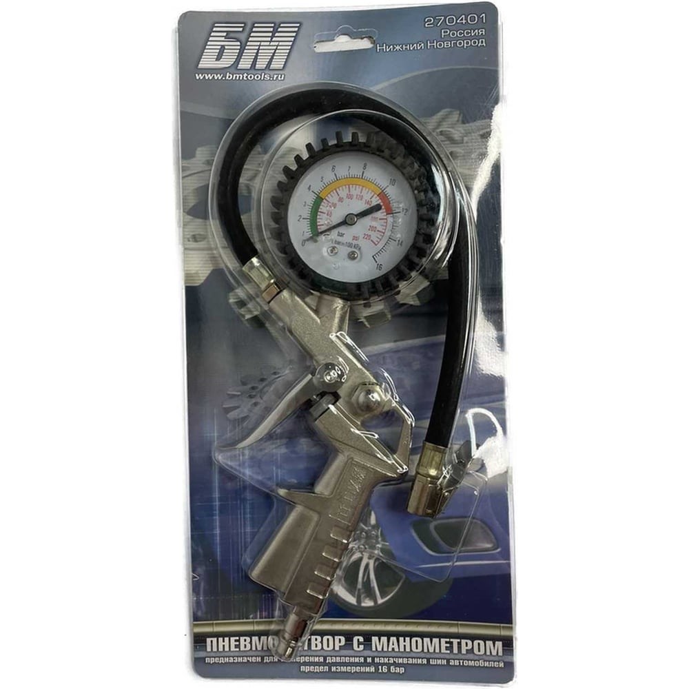 Пистолет для накачки шин с манометром БМ 270401 предназначен для накачки шин легковых автомобилей, мототехники и велосипедов. Получил широкое распространение в автосервисах и шиномонтажах. Модель оснащается гибким шлангом длиной 350 мм для работы в труднодоступных местах. Сбоку на рукоятке есть кнопка сброса давления. Корпус приспособления изготавливается из алюминиевого сплава, что придает конструкции прочность, легкость и износоустойчивость.