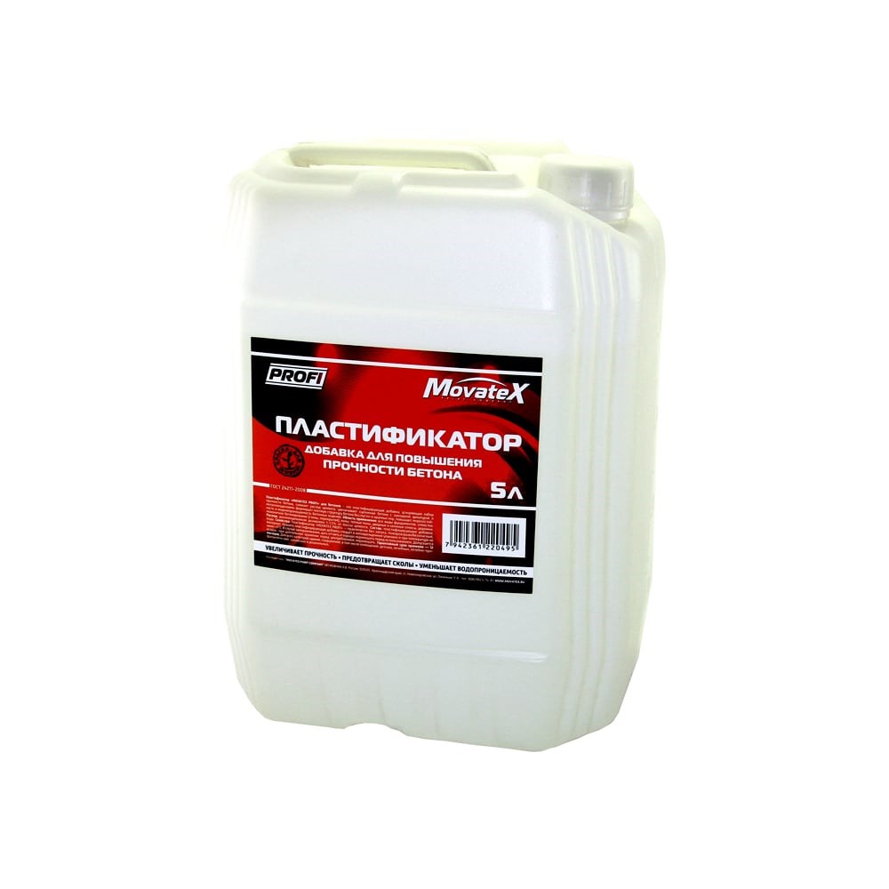 Пластификатор Movatex PROFI добавка для повышения прочности бетона, 5 л Т31836 добавляется в строительный раствор с целью ускорения набора прочности и увеличения сцепления бетона с закладной арматурой и металлоизделиями. Применяется для заливания фундамента, отмостки, пола, дорожек, монолитном бетонировании стен, перекрытий. Продукт формирует плотную структуру бетона без пустот и крупных пор. Состав повышает морозостойкость и водонепроницаемость бетонных изделий. Хранить при температуре не ниже +5 градусов. Технические характеристики: Срок хранения: 24 месяца. Расход: 1-1,5% от массы цемента. Практически без запаха.