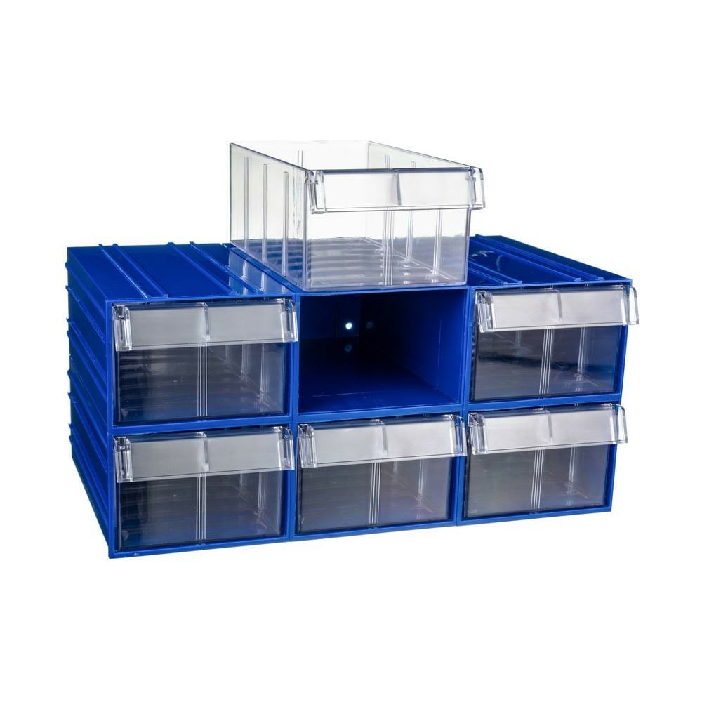 Пластиковый короб СТЕЛЛА-ТЕХНИК 140x250x100 мм, комплект 6 штук C-2-К6-синий-прозрачный с выдвижными ящиками. Изготовлен из полистирола и предназначен для хранения мелкоштучных изделий и комплектующих. Короба контейнеров для складского хранения имеют рельефную структуру днища и усиленные толстые стенки. За счет этого изделия справляются с достаточно высокими эксплуатационными нагрузками. Технические характеристики: Высота: 100 мм. Длина: 232 мм + 18 мм выступ ручки. Ширина: 140 мм. Внутренние полезные размеры выдвижного короба - 220х123х80 мм. Рекомендуемая нагрузка на 1 короб - не более 3 кг. Возможно установить 1 продольный разделитель или до 3-х поперечных разделителей. Продольная и поперечная перегородки одновременно не устанавливаются. Разделители в комплект не входят и продаются отдельно.