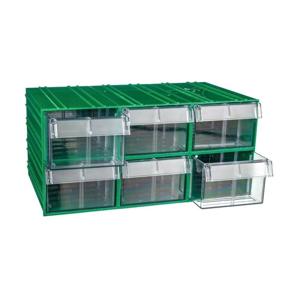 Пластиковый короб СТЕЛЛА-ТЕХНИК 140x250x100 мм, комплект 6 штук C-2-К6-зеленый-прозрачный с выдвижными ящиками. Изготовлен из полистирола и предназначен для хранения мелкоштучных изделий и комплектующих. Короба контейнеров для складского хранения С-2 имеют рельефную структуру днища и усиленные толстые стенки. За счет этого изделия справляются с достаточно высокими эксплуатационными нагрузками. Технические характеристики: Высота: 100 мм. Длина: 232 мм + 18 мм выступ ручки. Ширина: 140 мм. Внутренние полезные размеры выдвижного короба - 220х123х80 мм. Рекомендуемая нагрузка на 1 короб - не более 3 кг. Возможно установить 1 продольный разделитель или до 3-х поперечных разделителей. Продольная и поперечная перегородки одновременно не устанавливаются. Разделители в комплект не входят и продаются отдельно.