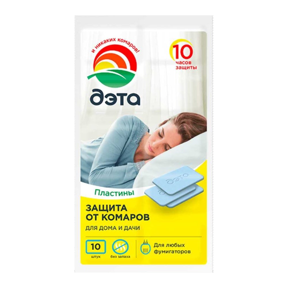Пластины от комаров Дэта - незаменимы для уничтожения комаров и других летающих насекомых (москитов, мошек) в помещении. Специально разработанная рецептура гарантирует безопасность и эффективность использования.Преимущества пластик от комаров Дэта:Одна пластина обеспечивает надежную защиту от комаров на протяжении всей ночи.Эффективны даже при открытых окнах.Без запаха.Гарантия безопасности и эффективности использования.Подходит для любых фумигаторов.