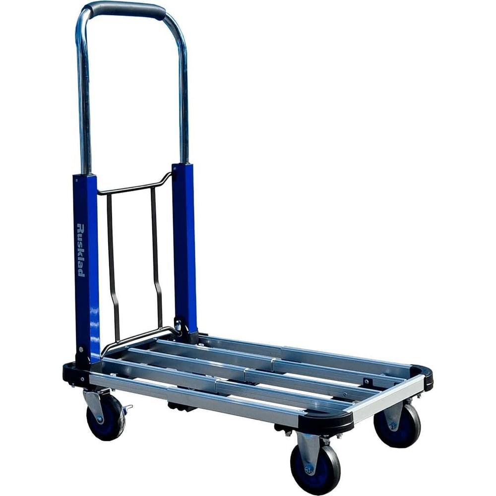 Тележка платформенная «ТП 150 В» Тележка платформенная предназначена для перемещения среднегабаритных и упакованных грузов. Тележка платформенная алюминиевая, складная конструкция. В разложенном виде габариты 715х420х950 мм, собранном виде габариты 550х420х250 мм. Грузоподъёмность 150 кг. Колесные опоры Ǿ125 мм: 2 неповоротные и 2 поворотные Грузоподъёмность: Максимальная грузоподъемность платформы – до 150 кг распределенной нагрузки. Покрытие – полимерное порошковое покрытие – Цвет — синий, RAL 5002. Транспортировка – изделие упаковано в индивидуальную, плотную упаковку.