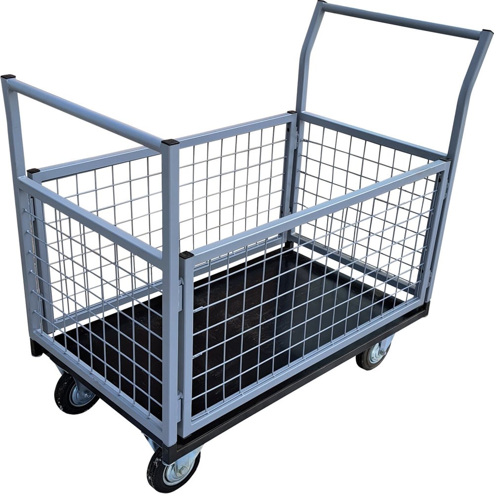 Четырехколесная платформенная тележка с двумя ручками и съемными бортами. Для перевозки груза. Применяется в различных сферах, для склада, торгующих и производственных предприятий.