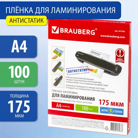 Пленки-заготовки для ламинирования АНТИСТАТИК, А4, КОМПЛЕКТ 100 шт., 175 мкм, BRAUBERG, 531795