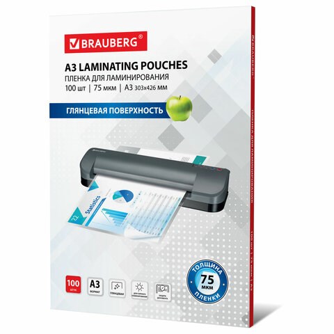 Пленка для ламинирования BRAUBERG формата А3 (303х426 мм) имеет уникальный состав: полиэтилентерефталат (PET), этиленвинилацетат (EVA), полиэтилен (LDPE). Промежуточный слой полиэтилена (LDPE) выступает как связующий элемент между слоями PET и EVA, служит дополнительной защитой от вероятного вытекания клея из-под пленки при ламинировании. Полиэтилен (PE) придает пакетам прочность эластичность и износостойкость. Глянцевое покрытие пленки способствует сохранению и максимальной передаче цвета ламинируемого изображения.