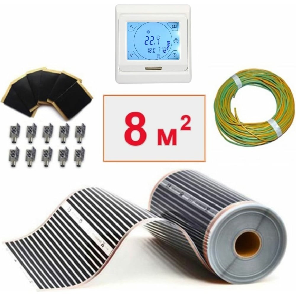 Плёночный электрический тёплый пол ТеплоСофт 8м.кв. с сенсорным терморегулятором плёнка 8м.кв./сенс представляет собой тонкую термопленку, нагревательными элементами которой являются карбоновые полосы, изолированные специальным слоем, который обеспечивает защиту от внешних физических воздействий. Дополнительные характеристики: Толщина: 0,38 мм Ширина метра погонного: 0.5 м Температура нагрева поверхности: до 60° С Шаг разреза: 25 см