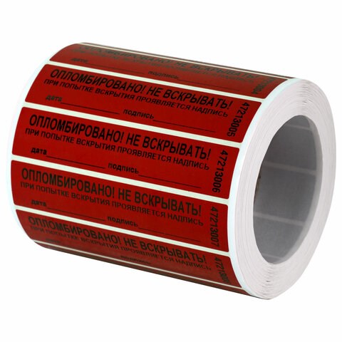 Предназначены для опломбирования объектов, на которых нет проушин или иных отверстий. При несанкционированном вскрытии на поверхности наклейки проявляется скрытый текст. После отклеивания невозможно приклеить обратно к поверхности опломбирования, скрыв индикацию срабатывания. Применяется для опломбирования почтовых и курьерских посылок, писем, архивов, контейнеров, сейфов, шкафов, дверей, монетоприемников, офисной техники, инкассаторских сумок, банкоматов, окон, медицинских контейнеров. При отклеивании не оставляют следа на опломбируемой поверхности.
