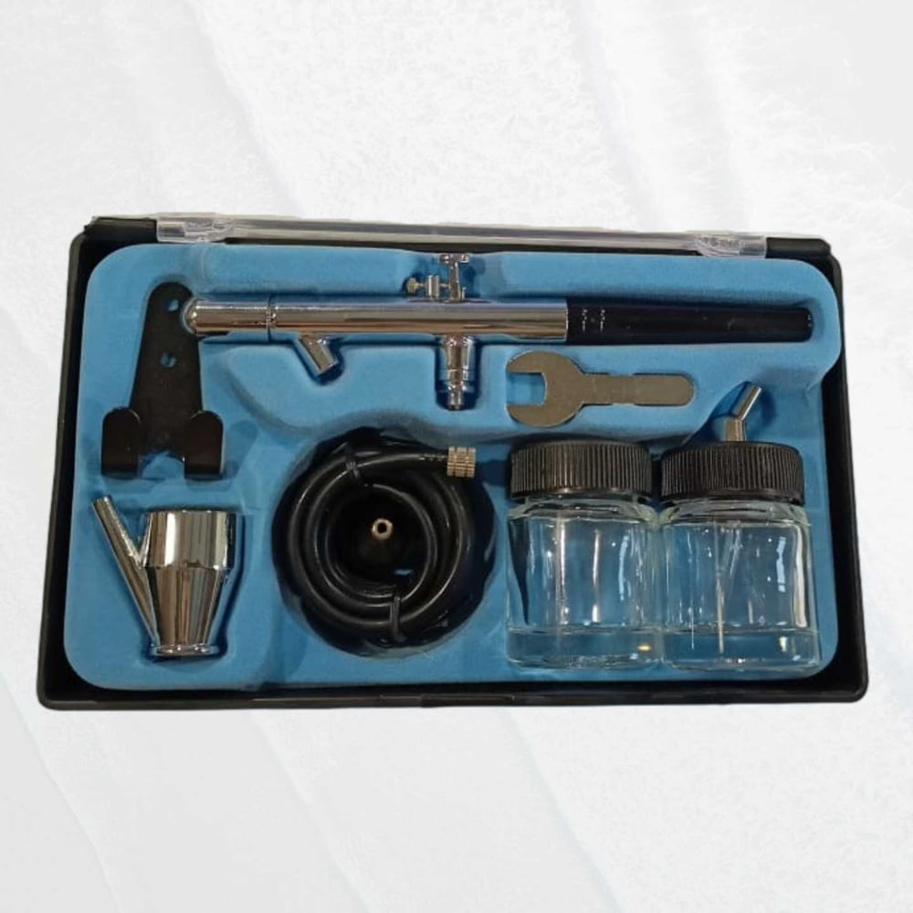 Аэрограф — это пневматический инструмент, который распыляет краску под давлением сжатого воздуха. Широко используется при выполнении декоративных работ, создания рисунков, прорисовки мелких элементов, ретуши и т. п. Для распыления краски требуется небольшое количество сжатого воздуха, рабочее давление в диапазоне от 0.5-3.5 бар. Корпус выполнен из металла, что обеспечивает долгий срок службы инструмента. Данный аэрограф укомплектован универсальным соплом, размер которого 0.35 мм, подходящий как для чёткой прорисовки тонких элементов, так и для нанесения фона на различные объекты. Также в комплект входят стеклянный и металлический бачки для краски, разных объёмов, стеклянный с более крупным, металлический с более мелким.