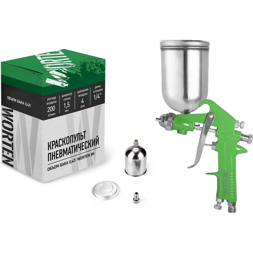 Краскопульт пневматический верхний бачок WORTEN 0,4л используется для обработки поверхности водно-меловыми и водно-известковыми составами при строительно-отделочных работах, при опрыскивании и побелке садов, дезинфекции помещений. До 30.06.2026 на данный товар действует условие безусловного возврата.