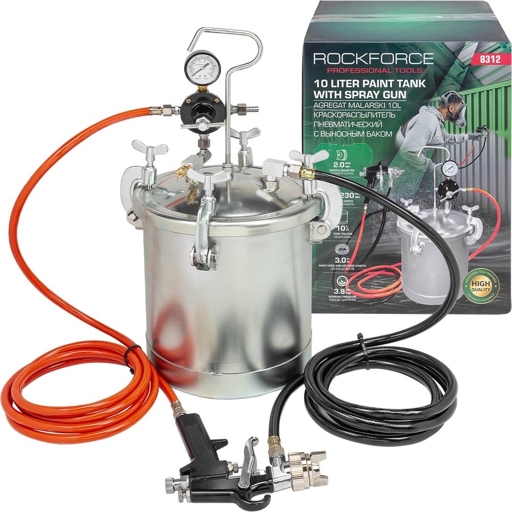 Краскопульт пневматический с выносным баком от бренда Rockforce используются для нанесения лакокрасочных материалов на поверхность. Они состоят из краскораспылителя и выносной емкости, которая может быть расположена на расстоянии от краскораспылителя. Технические характеристики: Емкость для краски имеет объем 10 литров, сопло с диаметром 2 мм и игла из нержавеющей стали, позволяет наносить краску тонким слоем и контролировать ее расход. Давление в системе может достигать 3,8 Bar, что позволяет контролировать интенсивность распыления, адаптируясь к различным типам краски и условиям работы. Регулятор факела распыления 180-230 мм, дает возможность легко настраивать ширину факела в зависимости от задачи, будь то мелкие детали или большие поверхности. Эффективная подача материала и воздуха совмещена с компрессором, что обеспечивает высокую производительность и качество нанесения краски. Длина шланга составляет 3 метра, что обеспечивает достаточное расстояние для работы. Применение: Краскораспылитель с выносной емкостью имеют широкое применение в различных отраслях, таких как строительство, ремонт, авторемонт, деревообработка и т.д. Они используются для нанесения красок на различные поверхности, такие как металл, дерево, пластик, стекло и т.д., а также для покраски автомобилей и других транспортных средств.