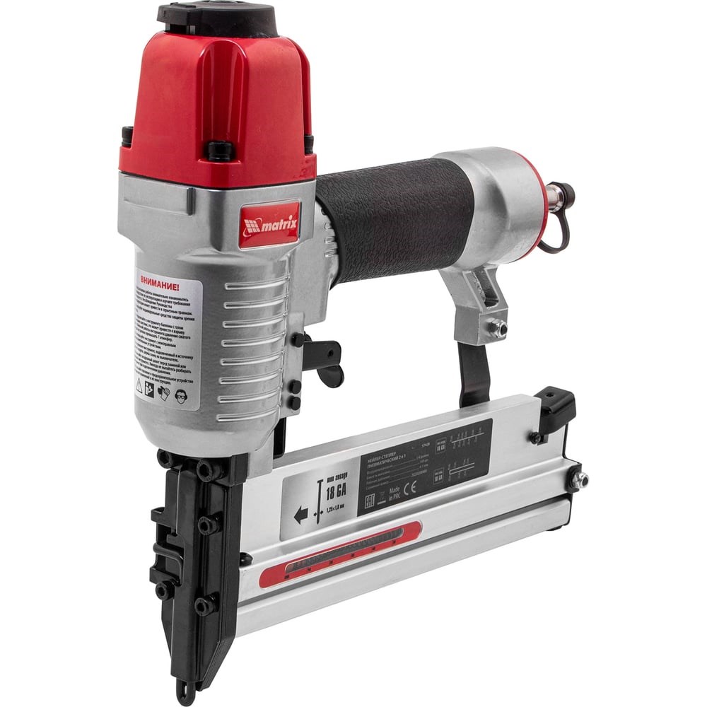 Пневматический нейлер-степлер Matrix 2 в 1, 57428 с функцией регулировки глубины забивания предназначен для быстрого скрепления различных материалов гвоздями и скобами 18GA. Его используют для сборки мебели и деревянных каркасов, обшивки и утепления домов, монтажа окон, дверей, плинтусов или напольных покрытий. Нейлер-степлер подключается к любым типам компрессоров, т.к. расход воздуха составляет всего 0,7 л/мин.