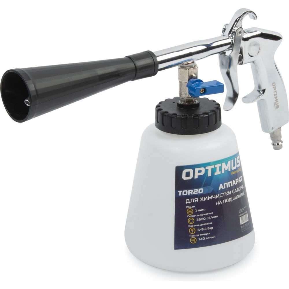 Пистолет торнадор на подшипнике для химчистки OPTIMUS HD TOR20 поможет легко и быстро очистить практически любые виды поверхности от загрязнений.Металлический штуцер обеспечивает надежное соединение и обладает антикоррозионным покрытием. Повышенный ресурс и надежность в работе благодаря высокооборотистому шариковому подшипнику в конструкции изделия. Пистолет оборудован фильтром, предотвращающим засорение.Рабочее давление: 6–9,2 барРасход воздуха: 140 л/минСкорость вращения: 3600 об/минОбъем бачка: 1 л OPTIMUS HD TOR20 отлично справляется с:Полной химчисткой салонов автомобилей (пластик, текстиль, кожа).Очисткой ковровых покрытий и мебели.Удалением загрязнений с бытовой и промышленной техники.Быстрой обработкой кожаных изделий и других поверхностей.