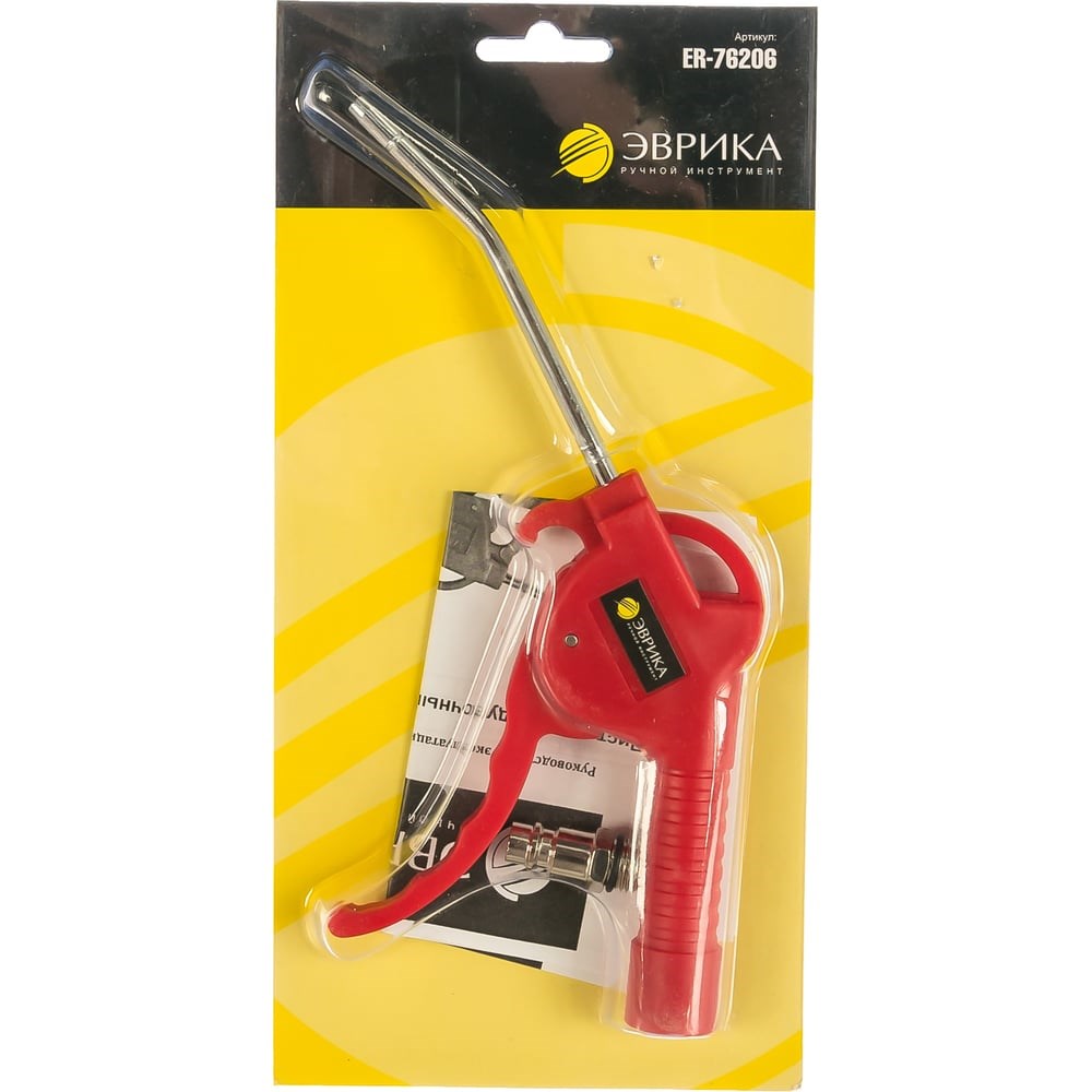 Продувочный пневматический пистолет ЭВРИКА ER-76206 применяется для очистки загрязненных поверхностей струей сжатого воздуха. Длинный изогнутый носик облегчает доступ в скрытые полости. Прочный пластиковый корпус устойчив к механическим повреждениям. Специальная петля дает возможность хранить инструмент в подвешенном состоянии.
