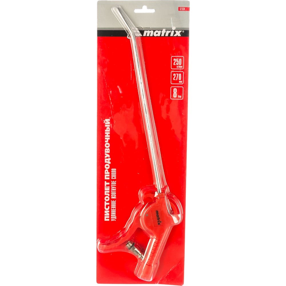 Пневматический продувочный пистолет с удлиненным изогнутым соплом MATRIX 270 мм 57334 используется для продувки малых отверстий и больших поверхностей. Удлиненный носик помогает работать в труднодоступных местах. Пластиковая рукоять повторяет форму пальцев, из-за чего пистолет удобно ложится в руку. Работа на сжатом воздухе снижает пожаро- и взрывоопасность, поэтому инструмент можно использовать во влажных помещениях.