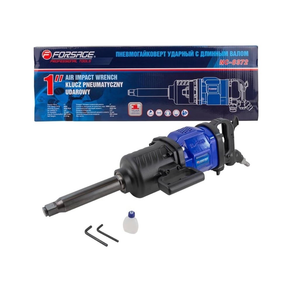 Пневматический ударный гайковерт 1" от бренда Forsage с длинным валом и моментом затяжки 4000 Нм оснащён квадратом шпинделя размером 1" (25,4 мм), что обеспечивает совместимость с широким спектром головок и насадок различных размеров. Высокий крутящий момент и эффективный ударный механизм позволяют инструменту успешно справляться с высоконагруженными резьбовыми соединениями. Наличие реверса и регулировки усилия затяжки обеспечивает точность и удобство работы. Вес инструмента составляет 21 кг, он оснащён основной рукоятью пистолетного типа и дополнительной боковой ручкой для комфортного и надёжного удержания. В комплект входят ёмкость для смазки и регулировочные ключи.Высокий крутящий момент 4000 Нм — обеспечивает мощную и эффективную работу с самыми сложными резьбовыми соединениями.Квадрат шпинделя 1" (25,4 мм) — совместимость с широким ассортиментом головок и насадок.Ударный механизм с реверсом и регулировкой усилия — позволяет точно контролировать процесс затяжки и откручивания.Удобная эргономика — пистолетная рукоять и дополнительная боковая ручка обеспечивают комфорт и безопасность при работе.Комплектация — включает ёмкость для смазки и регулировочные ключи для поддержания инструмента в отличном состоянии.Широкая сфера применения — идеален для авторемонтных предприятий, шиномонтажных мастерских и работы с грузовыми автомобилями высокой грузоподъёмности.