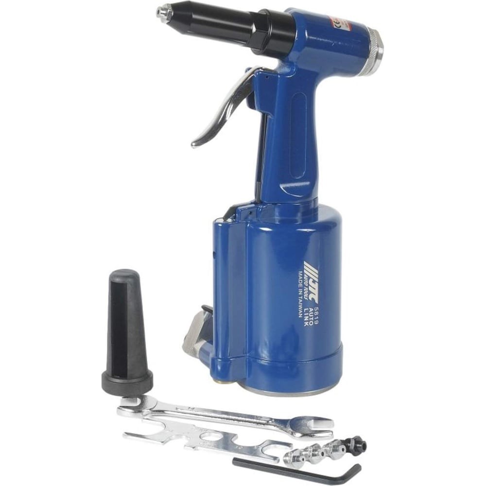 Пневматический заклепочник JTC 5819 предназначен для профессионального использования в мастерских по ремонту автомобилей или на строительных площадках. Благодаря небольшому весу и "пистолетной" форме корпуса инструмент удобно держать в руке, хранить, а также переносить от одной рабочей точки к другой. Используется для соединения различных, преимущественно, металлических деталей и изделий алюминиевыми клепками. Расход воздуха - 5 л/заклепка.