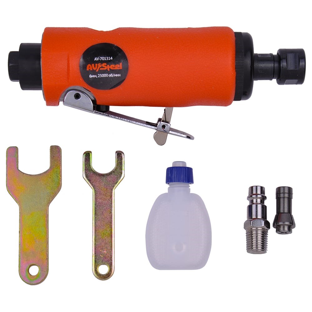 Пневмобормашина AV Steel AV-701314 может использоваться для шлифовки, зачистки, фрезерования и гравирования. Оснащена цанговым патроном на 6 мм, в комплектации имеется цанговый патрон на 4 мм. Высокая скорость вращения, до 22000 об/мин, позволяет добиться высокого качества шлифования требуемой поверхности. Вращательный момент, создающийся пневмотурбиной, дает ряд достоинств: высокий ресурс, отсутствие перегрева, устойчивость к перегрузкам, возможность работать длительное время, а также высокую пожаробезопасность. Рекомендуется использовать подключение шлангом со внутренним диаметром не менее 8 мм.