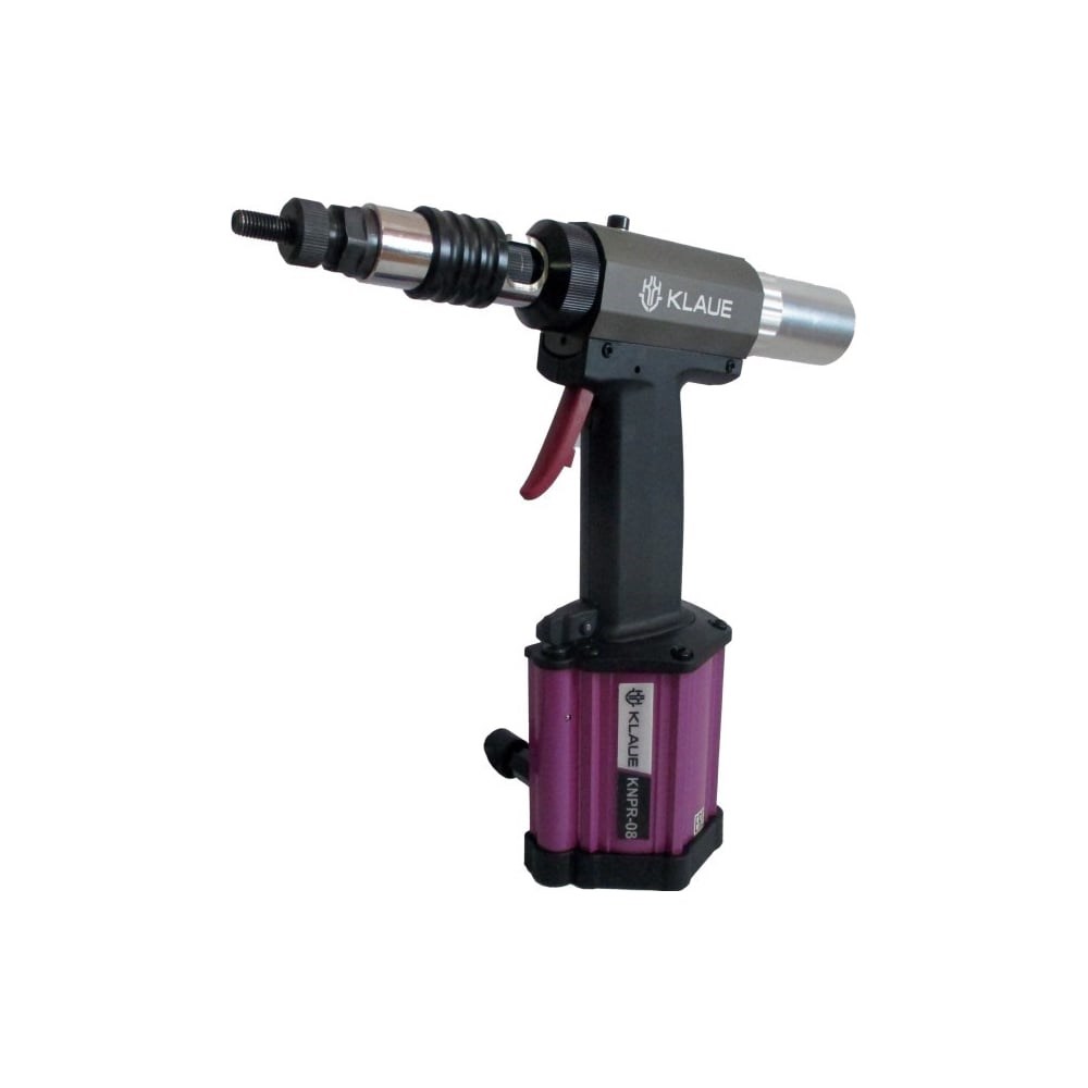 Универсальный пневмогидравлический заклепочник для резьбовых заклепок. Пневмогидравлический заклепочник KLAUE KNRP-08 предназначен для работы любым видом гаечных заклёпок: шестигранных, полушестигранных, цилиндрических из алюминия, стали и нержавейки. Диаметры заклёпок для пневмогидравлического резьбового заклепочника: М3, М4, М5, М6 и М8. Резьбовой элемент: винт DIN 912, класс прочности 12,9 с внутренним шестигранником. Наличие регулировочной шкалы для точной и быстрой наладки. Автоматическое накручивание заклепки при касании шпильки и выкручивание после установки. Наличие реверса ходового вала Сила вытягивания 14000H - 19600 Н Рабочий ход 1 - 7 мм Время установки одной заклепки: не более 2-х секунд
