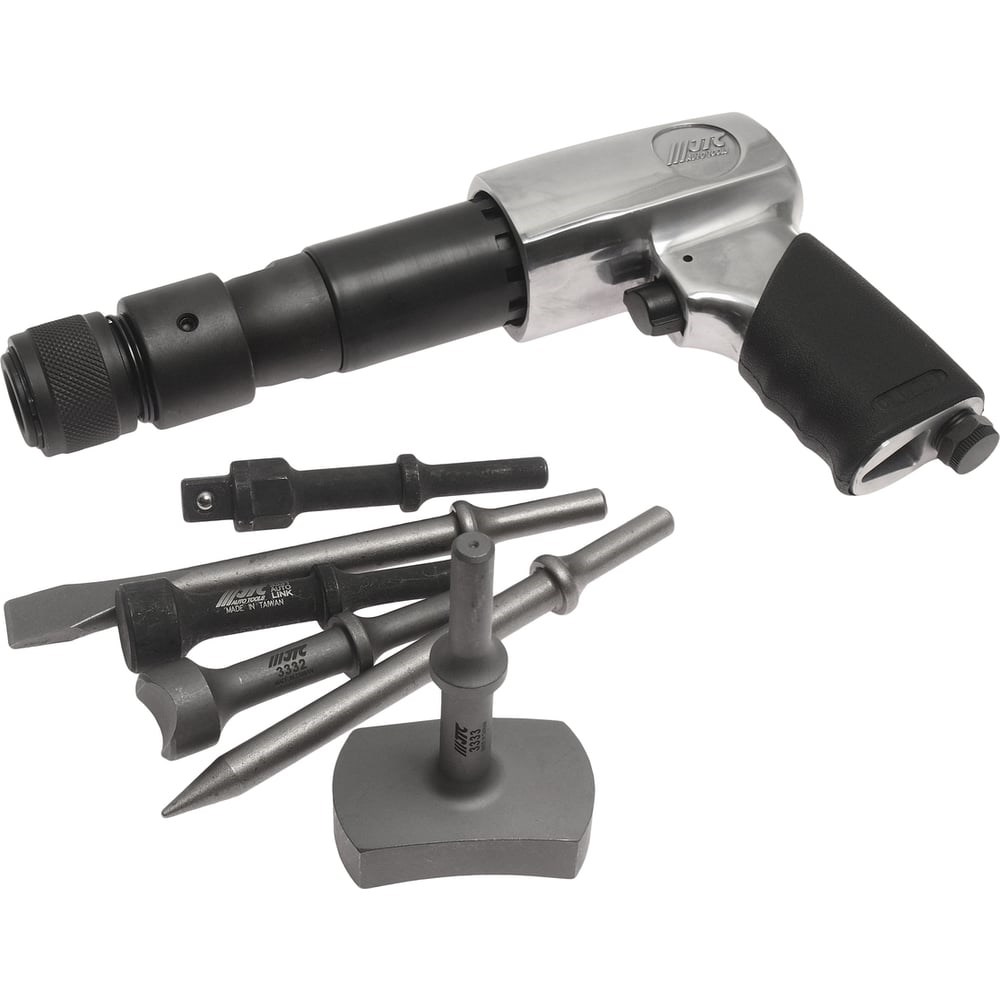 Пневмомолоток JTC с набором зубил JTC-3310K подойдет для демонтажа различных конструкций, а благодаря входящим в комплект зубилам, инструмент позволит выполнять работы по выдалбливанию отверстий, гнезд и пазов различного размера. Молоток обладает прочной конструкцией и удобной рукояткой. Изделие работает благодаря компрессору, который через шланг подает сжатый воздух в инструмент и приводит в действие ударный механизм.