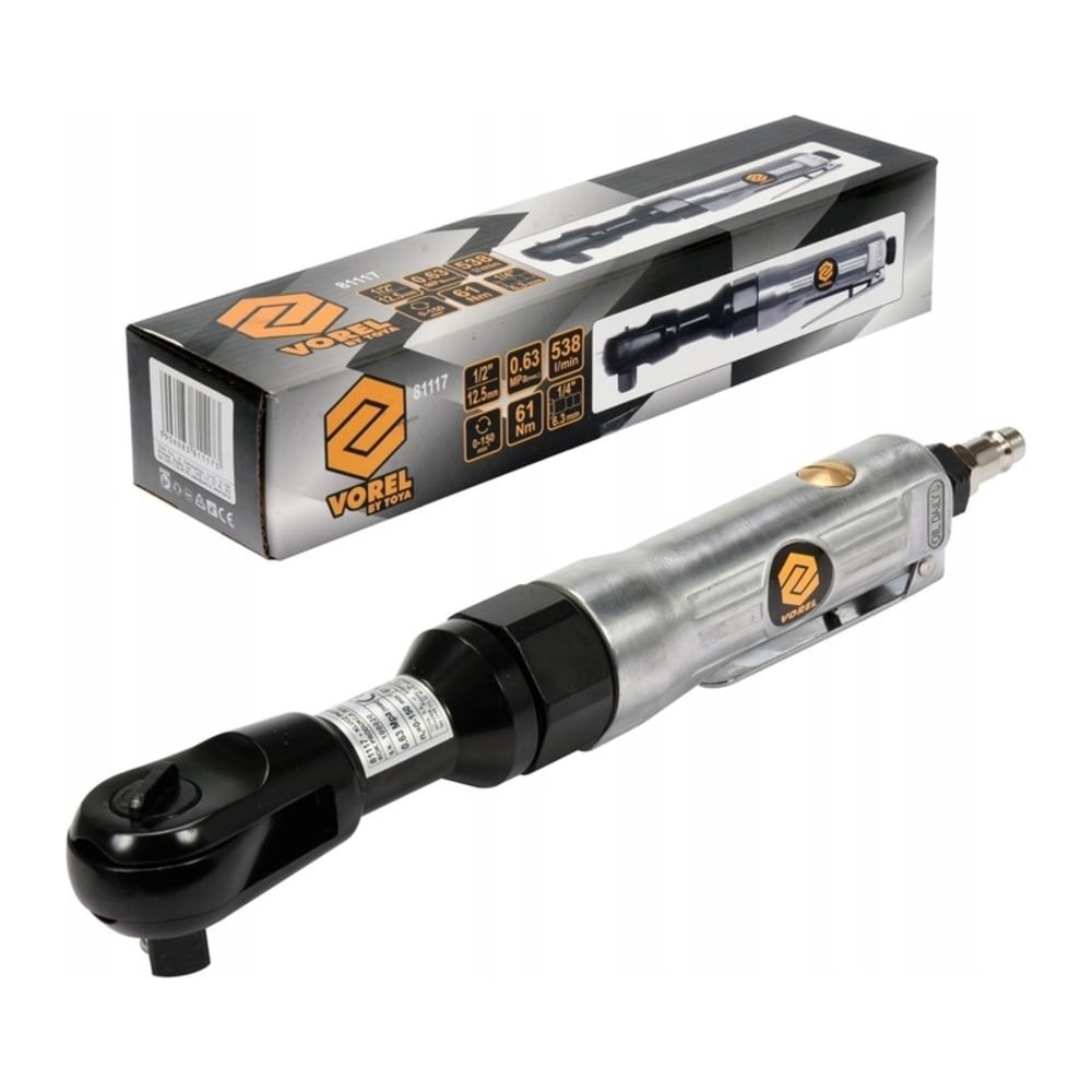 Пневмотрещотка VOREL 1/2" 81117 пригодится в мастерской и гараже для откручивания и закручивания крепежа. Имеет компактные размеры, которые упрощают работу в стесненных условиях. Металлический корпус устойчив к механическим повреждениям. Надежный рабочий механизм обеспечивает долгий срок службы трещотки. Температура выходящего воздуха регулируется в диапазоне 360 градусов.