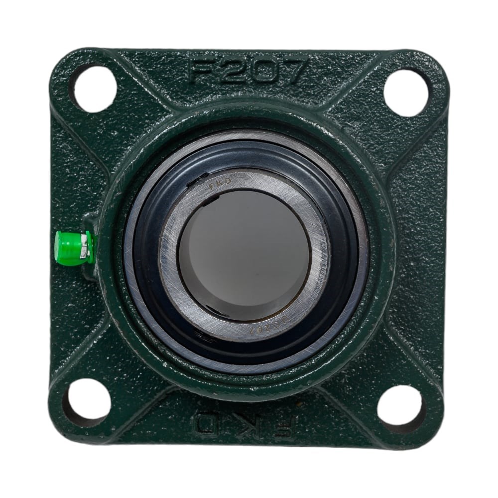 Подшипник шариковый радиальный однорядный с двумя уплотнениями, широким внутренним кольцом и установочным винтом во внутреннем кольце. Подшипник является самоцентрирующимся (самоустанавливающимся), так как корпус имеет сферическое посадочное отверстие, а сам подшипник сферическое наружное кольцо, что позволяет подшипнику слегка перемещаться в корпусе компенсируя перекос вала. Подшипник имеет отверстия и канавку для смазки, корпус комплектуется пресс-маслёнкой. Направление воспринимаемых нагрузок - радиальное и осевое в обе стороны. Монтаж на валу удобен и прост. Установлен в корпус F фланцевого типа. В зависимости от производителя подшипник UC может быть установлен в корпусе ровно либо с небольшим смещением (с преднатягом). При монтаже на вал подшипник принимает необходимое положение в посадочном отверстии.