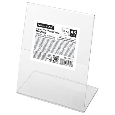 Устойчивая практичная конструкция изготовлена из прозрачного акрилового стекла толщиной 1 мм. Имеет размер 150х105 мм. Максимальная толщина вставки составляет 1,5 мм, глубина основания держателя информации - 75 мм, ширина ножки - 1 мм. Идеально подходит для формата А6.