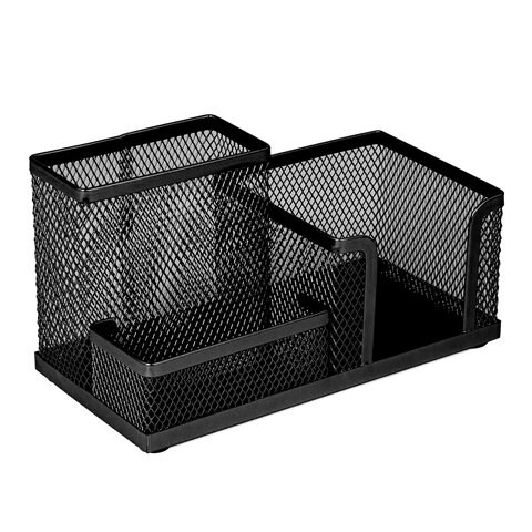 Изготовлена из металлической сетки. Имеет размеры 102х186х95 мм. Состоит из 3-х отделений: одного для бумажного блока размером 90х90 мм и двух - для пишущих принадлежностей и канцелярских мелочей. Мягкие подушечки на дне предотвращают скольжение и порчу мебели. Подставка-органайзер упакована в фирменную коробку. Поставляется без канцелярского наполнения.