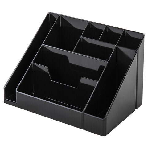 Изготовлена из высококачественного пластика. Имеет размеры 115х160х105 мм. Состоит из 9-ти отделений для канцелярских мелочей и пишущих принадлежностей. Поставляется без наполнения.
