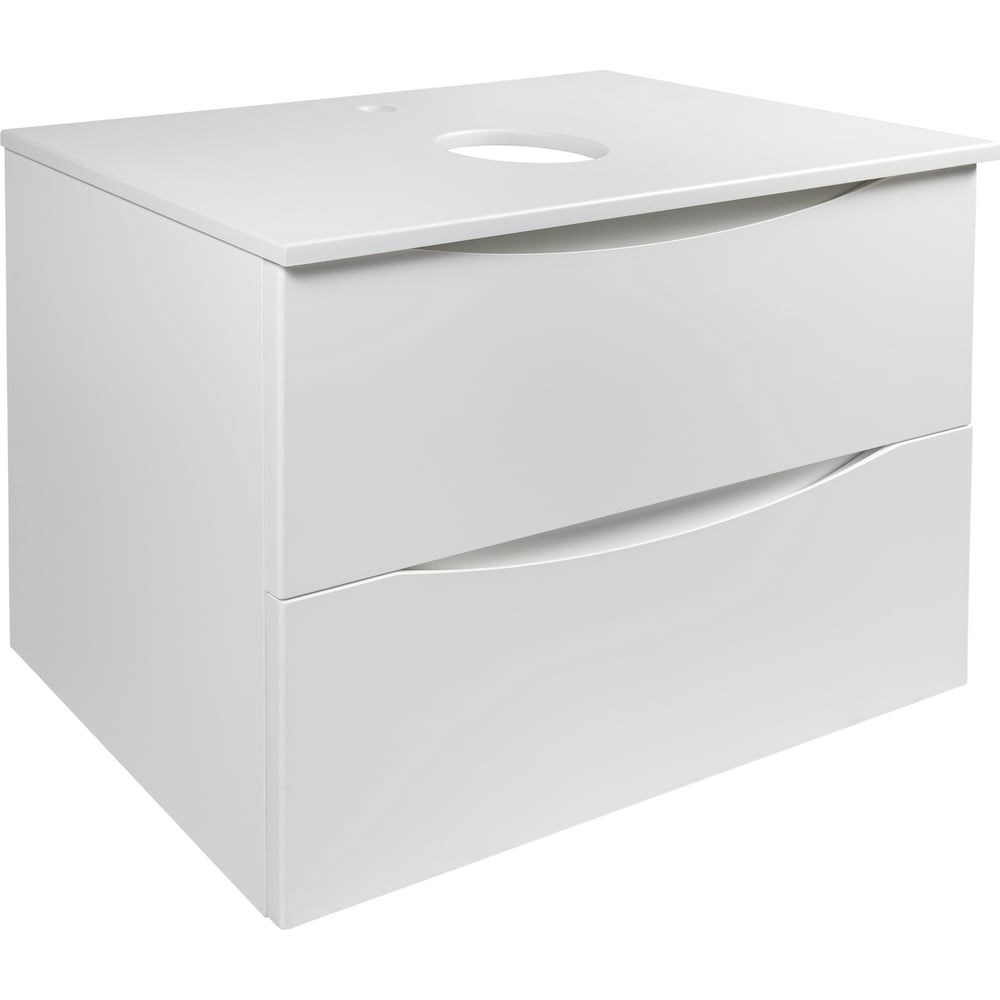 Фасад МДФ с интегрированными ручками, покрыт высококачественной премиальной краской, цвет - серый матовый.Корпус: МДФ, краска, цвет - белый матовый.Столешница: МДФ, пленка под дерево.Направляющие скрытого монтажа с доводчиками. Внутри ящики ЛДСП серого цвета.